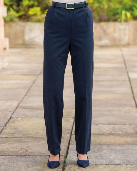 Ladies softly brushed pure cotton twill trousers. Comfortable and durable. Classic ladies trousers with front zip and button fastening. Flat front, back darts, side seam pockets and side back waist elastication. With belt loops. Pure cotton is both light and comfortable.