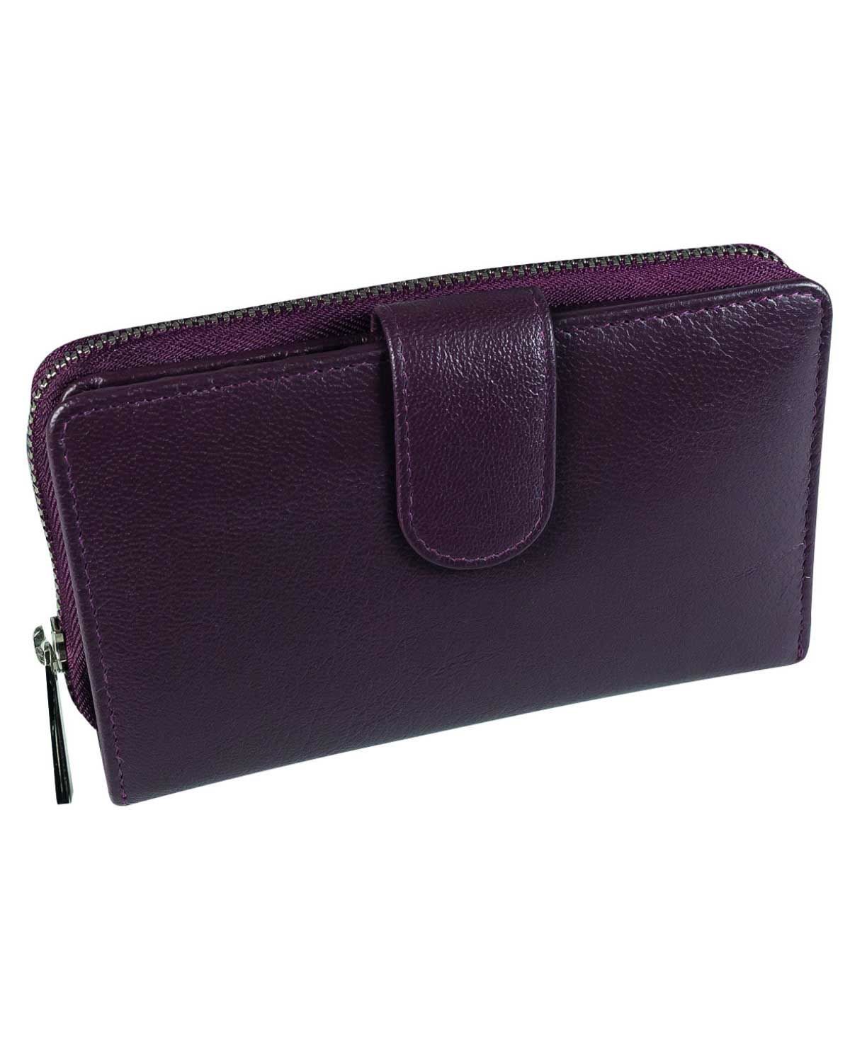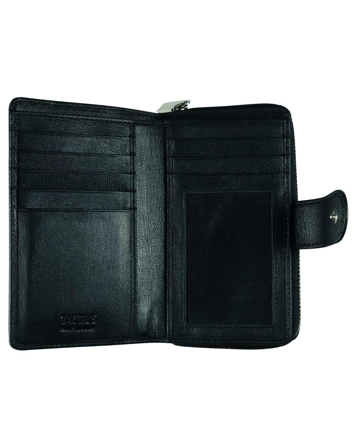 Ladies zipped leather purse is a perfect handbag companion, with inner and outer pockets for coins. It has a secure stud fastening for notes and credit card compartment. Finished with decorative stitching detail. 14cm wide, 9cm high. Black, Burgundy.