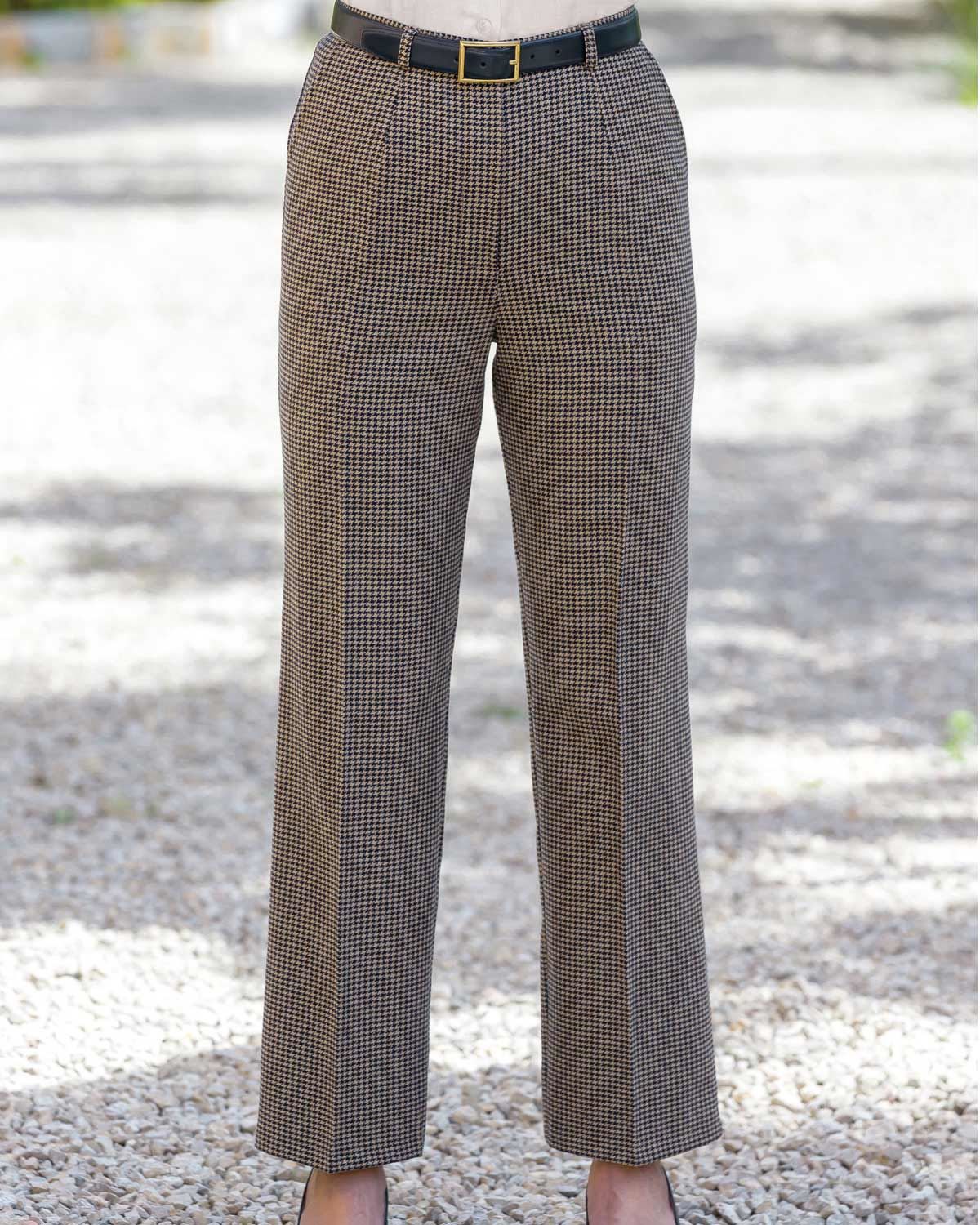Ladies flat fronted style trousers with front zip and button fastening. Half lined with side seam pockets and belt loops. Side back waist elastication for added comfort. Versatile and easycare wool blend fabric in a classic toffee and navy dog tooth design. Style with any of our separates for an elegant look.
