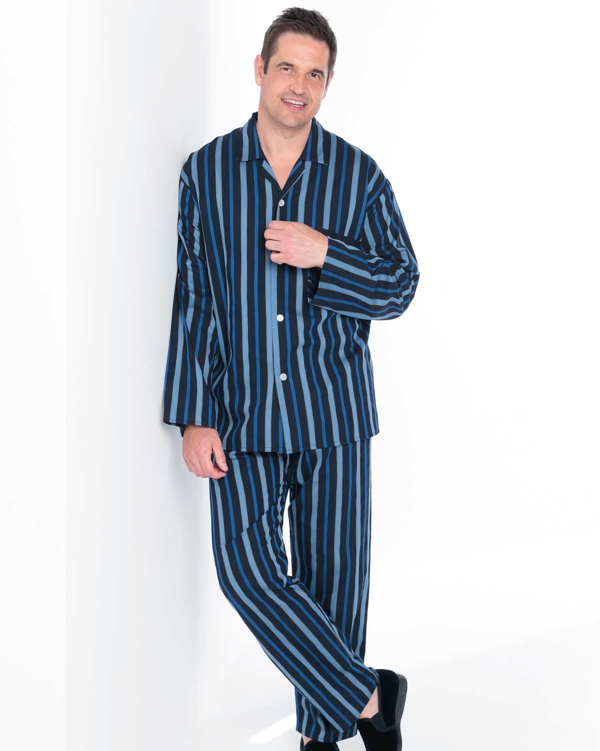 Mens Pure Cotton pyjamas with a choice of cord tie or elasticated waist fastenings. Gently shaped collar and single breast pocket on pyjama top. These pyjamas will keep you comfortable all night long.
