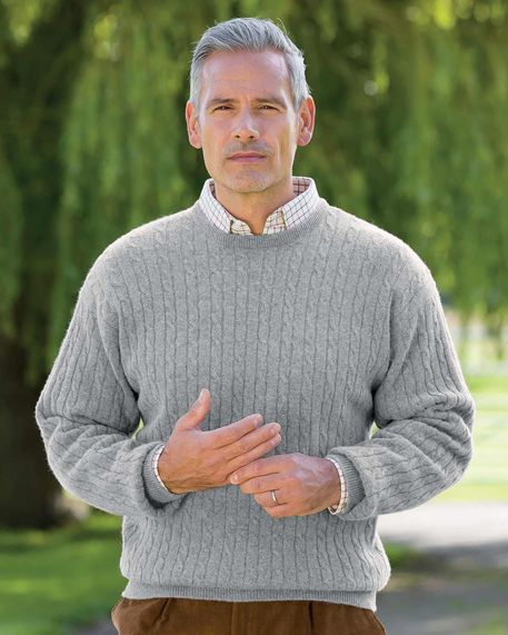 Men’s lambswool jumpers crew neck style, with all over cable design. These classic men’s knitted crew neck jumpers are satisfyingly warm and snug without being bulky or cumbersome. The perfect choice for long autumnal evenings and cold winter days. Our collection of men’s cable knit crew neck jumpers offer a great way to keep warm and cosy.