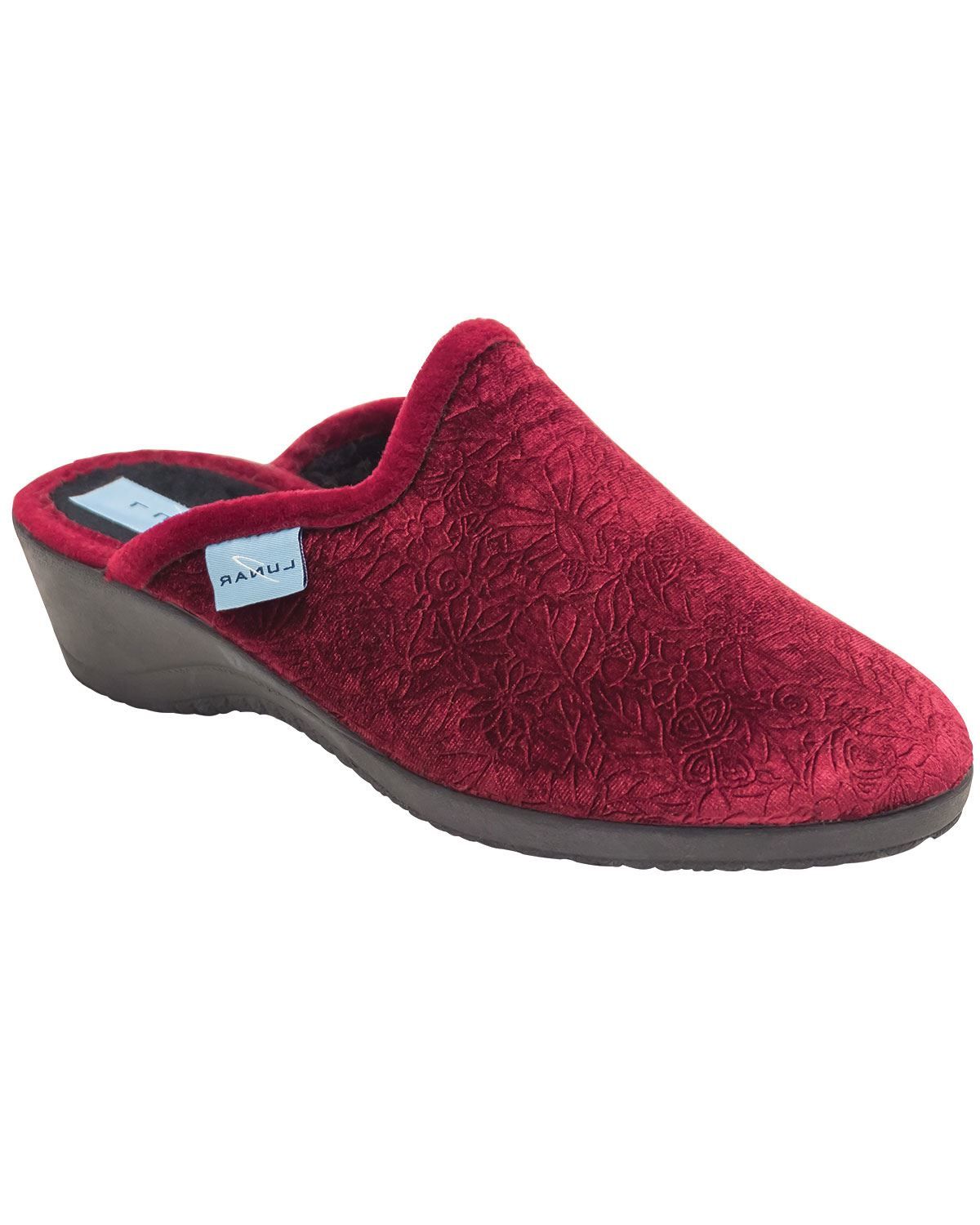Ladies slip on slipper with a tonal decorative floral design. Man-made sole.