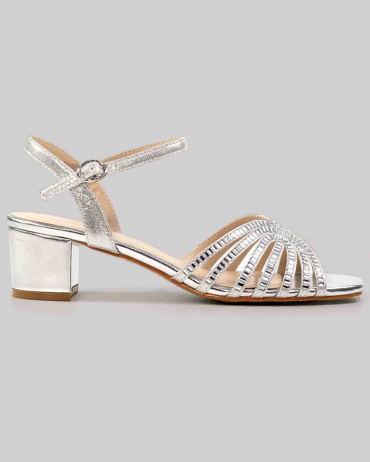 Elevate your style with our chic small block heel sandals. The metallic detailing adds a touch of glamour. Ankle strap fastening with adjustable buckle provides a secure and comfortable fit.