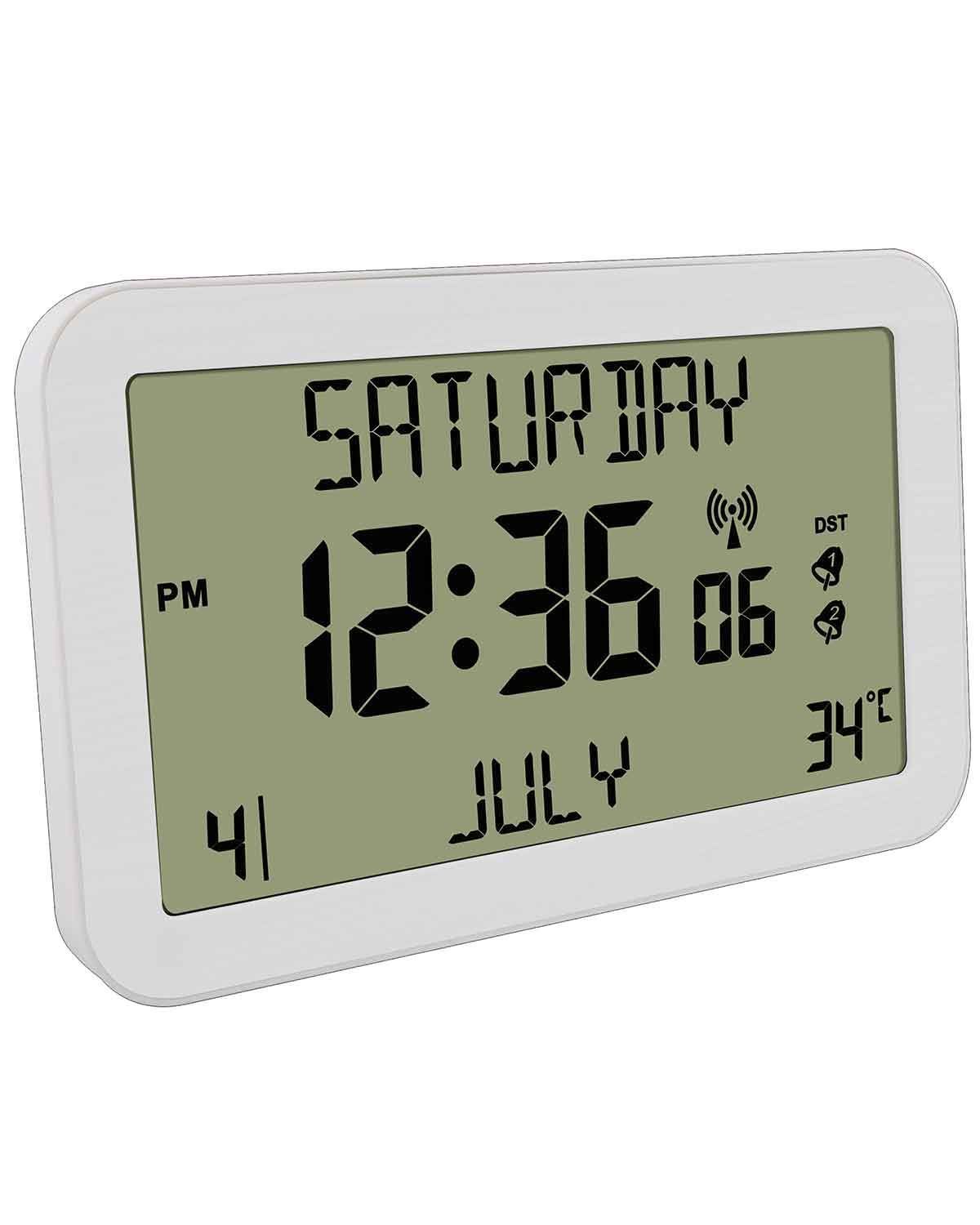 This extra-large clock spells out the day of the week, date, month and temperature in full and tells you the exact time in easy-read 2.5cm digits. The internal radio-controlled aerial ensures accuracy to one second in 10 million years. Free-standing or wall-mounted.